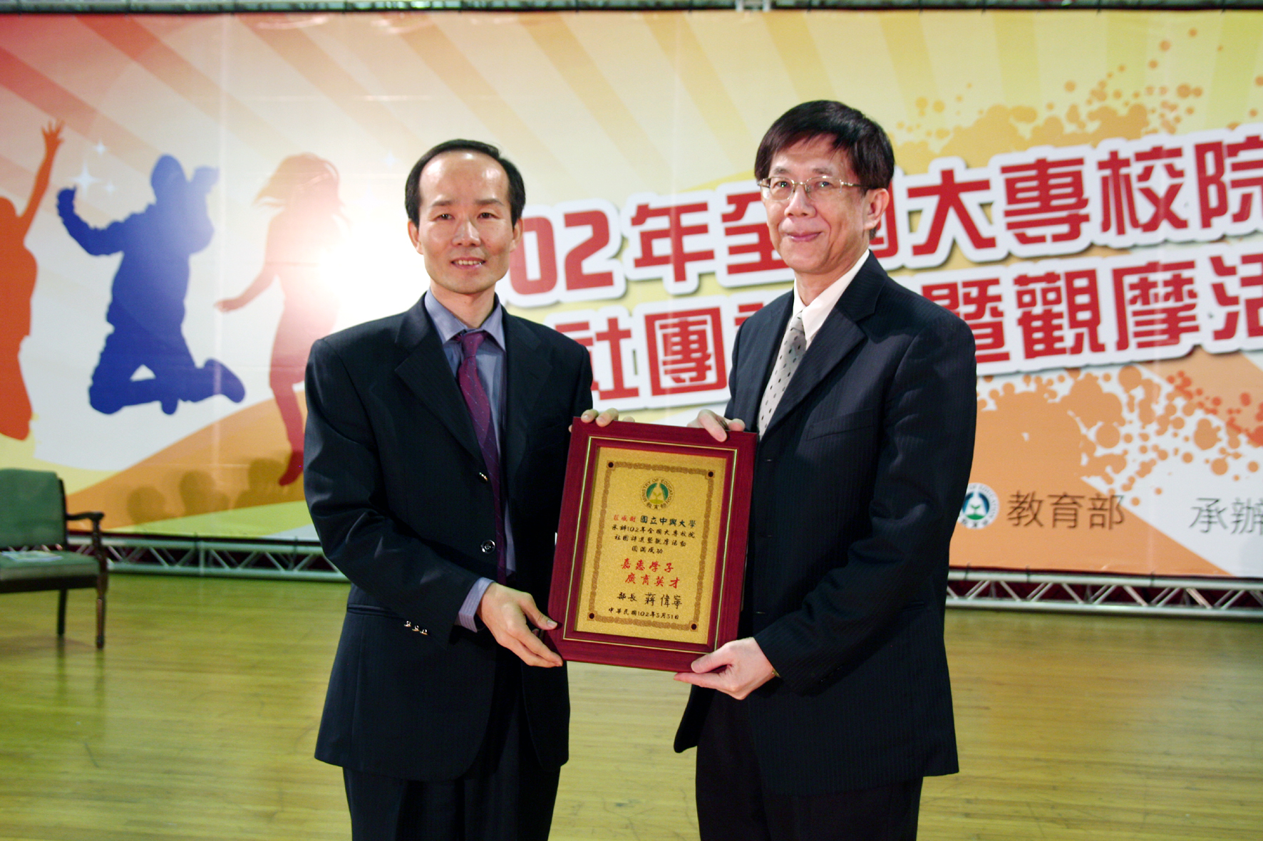 典禮最後,主辦單位教育部特別頒發「最佳服務獎」給此次活動的承辦單位國立中興大學,感謝興大動員上百位人力全心投入此次社團評鑑暨觀摩活動,活動圓滿結束,承辦單位的服務獲得來自全台各地師生的讚譽,興大學務同仁的努力功不可沒。感謝狀由教育部學務暨特殊教育司劉仲成司長頒發,中興大學徐堯煇副校長代表受贈。