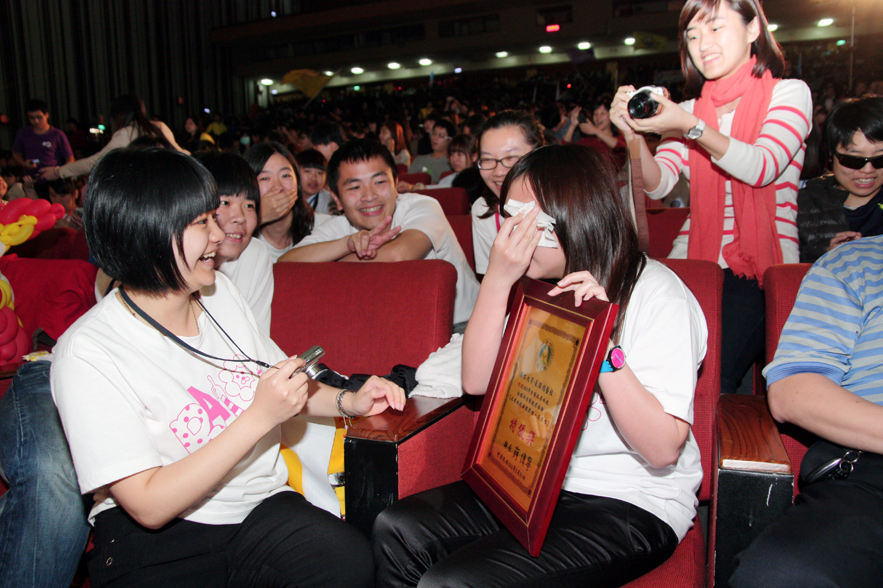 ![]() 教育部學生事務及特殊教育司劉仲成司長(左)頒發「最佳服務獎」給興大徐堯煇副校長。 ![]() 劉仲成司長(中)頒發「特優獎」給得獎社團。 ![]() 獲得「特優獎」的社團幹部感動得喜極而泣,社團們一邊安慰領獎人、一邊開心地圍著拍照。 |