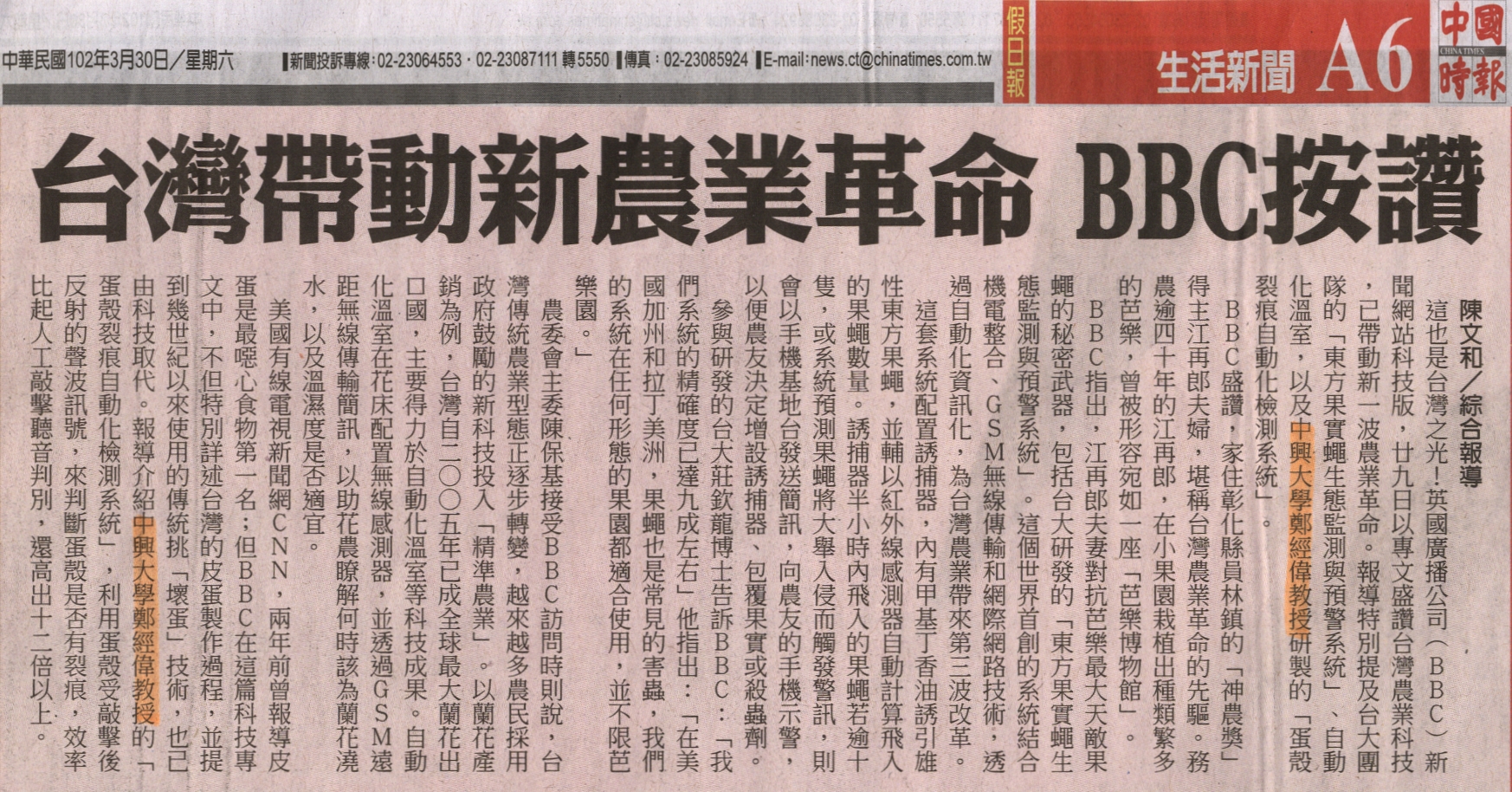 這也是台灣之光!英國廣播公司(BBC)新聞網站科技版,廿九日以專文盛讚台灣農業科技,已帶動新一波農業革命。報導特別提及台大團隊的「東方果實蠅生態監測與預警系統」、自動化溫室,以及中興大學鄭經偉教授研製的「蛋殼裂痕自動化檢測系統」。