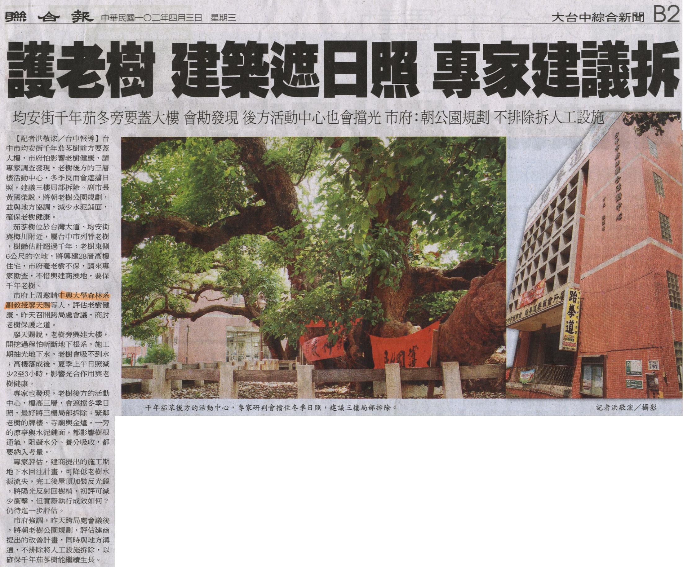 台中市均安街千年茄苳樹前方要蓋大樓,市府怕影響老樹健康,請專家調查發現,老樹後方的三層樓活動中心,冬季反而會遮擋日照,建議三樓局部拆除。副市長黃國榮說,將朝老樹公園規劃,並與地方協調,減少水泥鋪面,確保老樹健康。