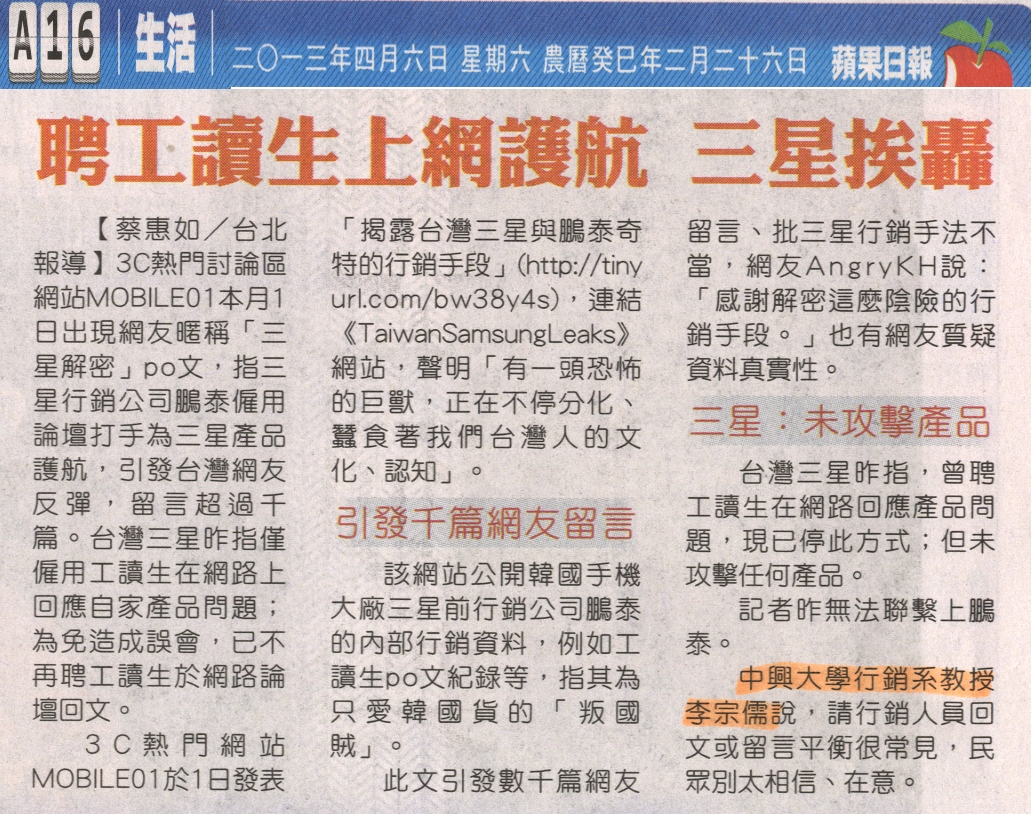 台灣三星昨指,曾聘工讀生在網路回應產品問題,現已停此方式;但未攻擊任何產品。