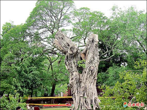 孔廟前年死亡的百年老榕樹,目前尚留枯樹幹,而它後面的大榕樹也染病,枝葉稀疏,擔心隨時會倒。(記者蔡文居攝)