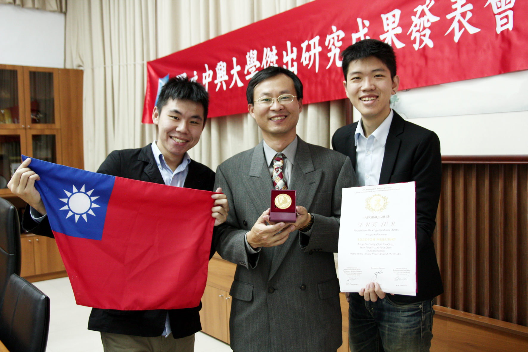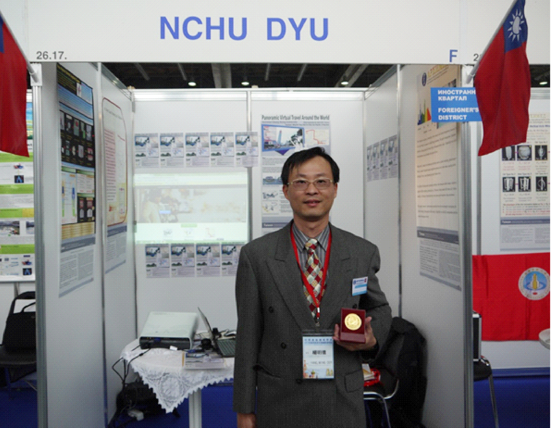 楊明德教授(中)與博士生趙智凡(右)、碩士生吳浩平(左)共同開發「虛擬環球旅遊系統」獲俄發明展金牌。