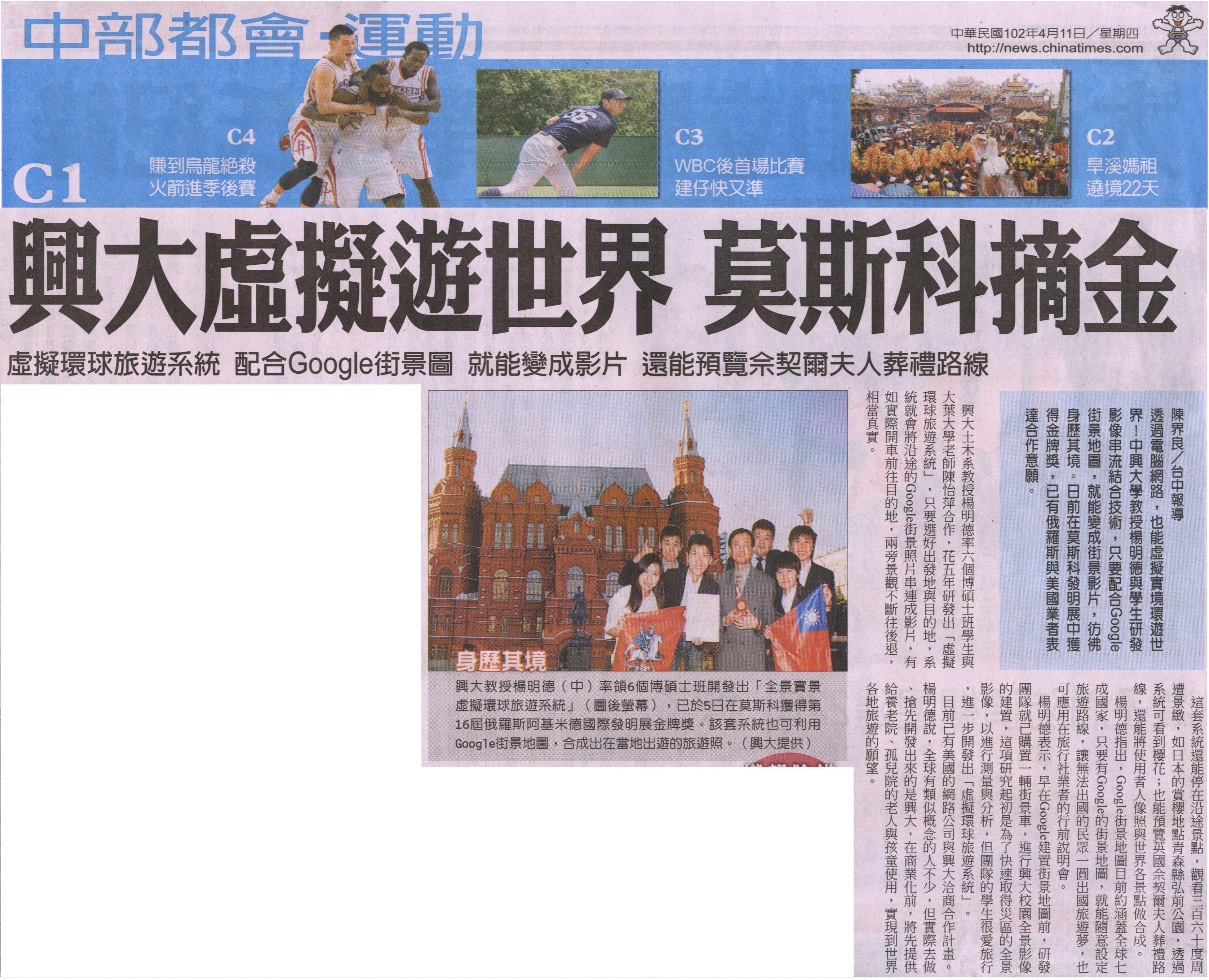 興大土木系教授楊明德率六個博碩士班學生與大葉大學老師陳怡萍合作,花五年研發出「虛擬環球旅遊系統」,只要選好出發地與目的地,系統就會將沿途的Google街景照片串連成影片,有如實際開車前往目的地,兩旁景觀不斷往後退,相當真實。