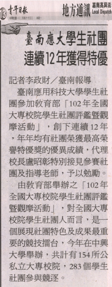 【媒體報導】臺南應大學生社團 連續12年獲得特優
