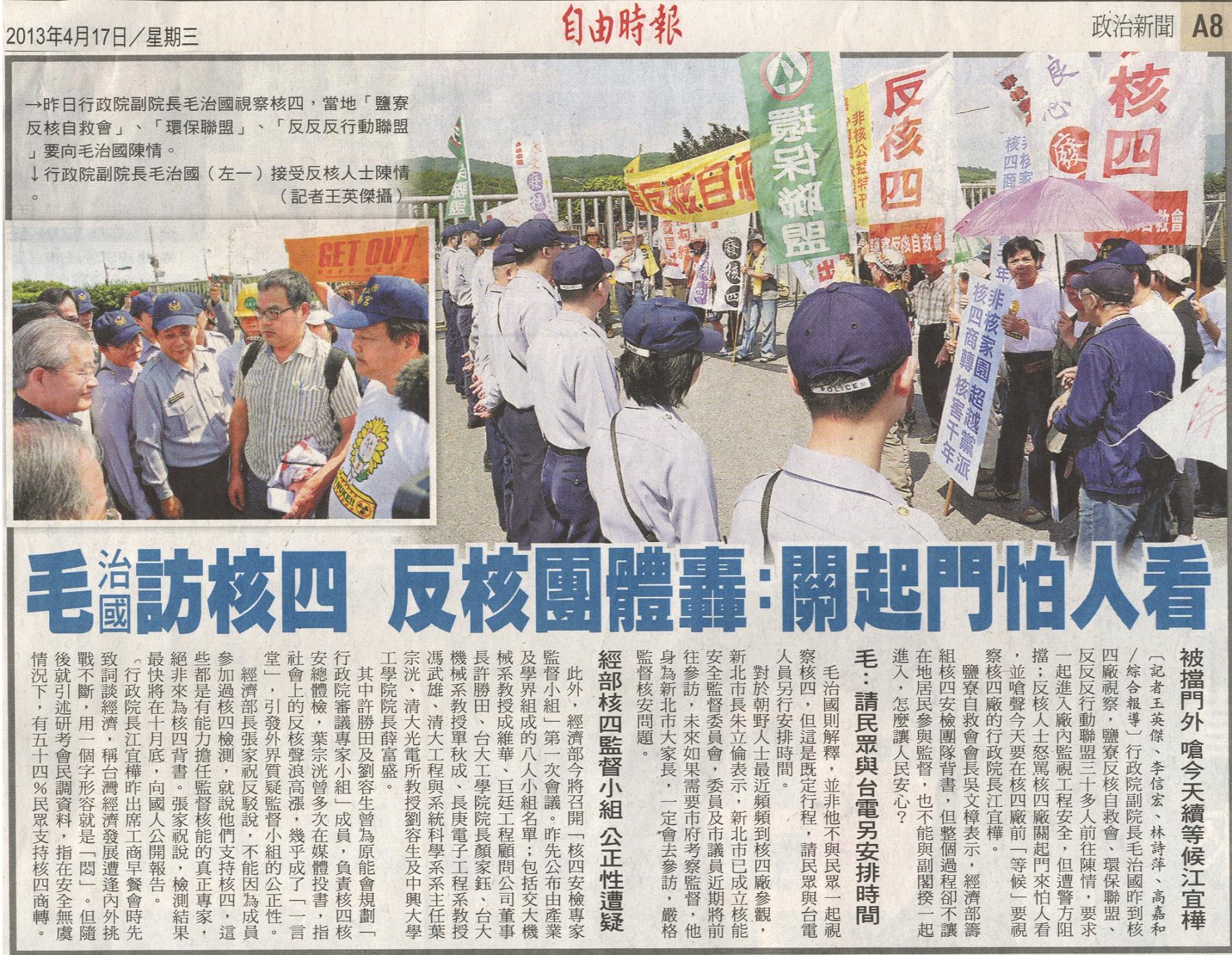 行政院副院長毛治國昨到核四廠視察,鹽寮反核自救會、環保聯盟、反反反行動聯盟三十多人前往陳情,要求一起進入廠內監視工程安全,但遭警方阻擋;反核人士怒罵核四廠關起門來怕人看,並嗆聲今天要在核四廠前「等候」要視察核四廠的行政院長江宜樺。