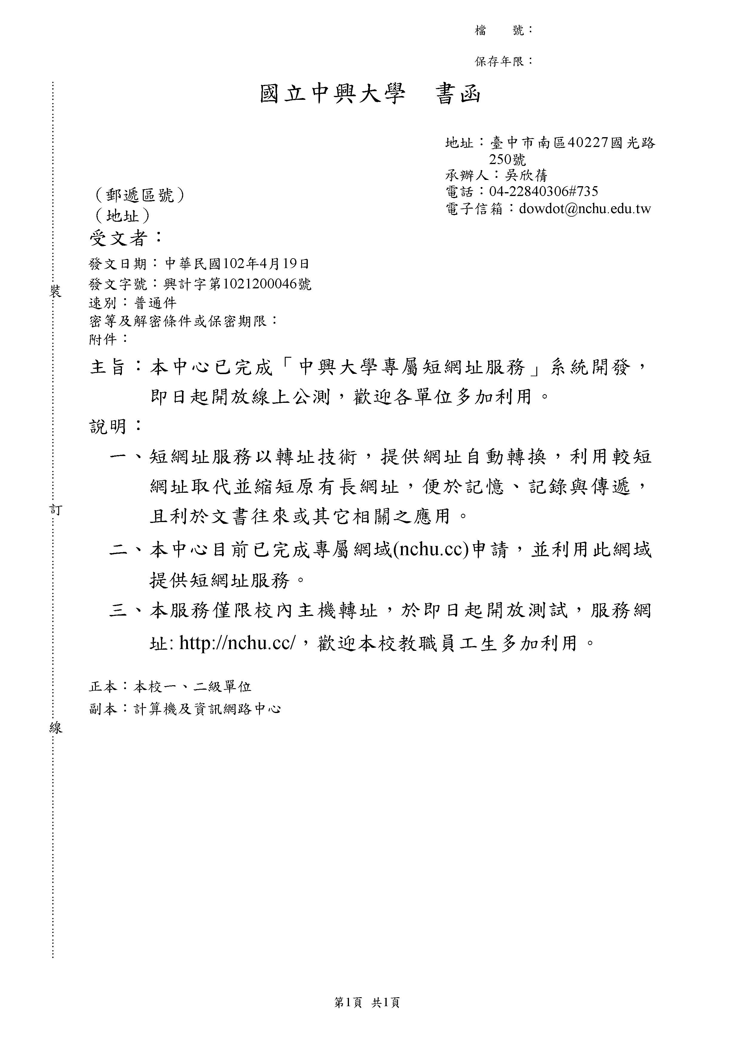 3.本服務僅限校內主機轉址,於即日起開放測試,服務網址: http://nchu.cc/,歡迎本校教職員工生多加利用。