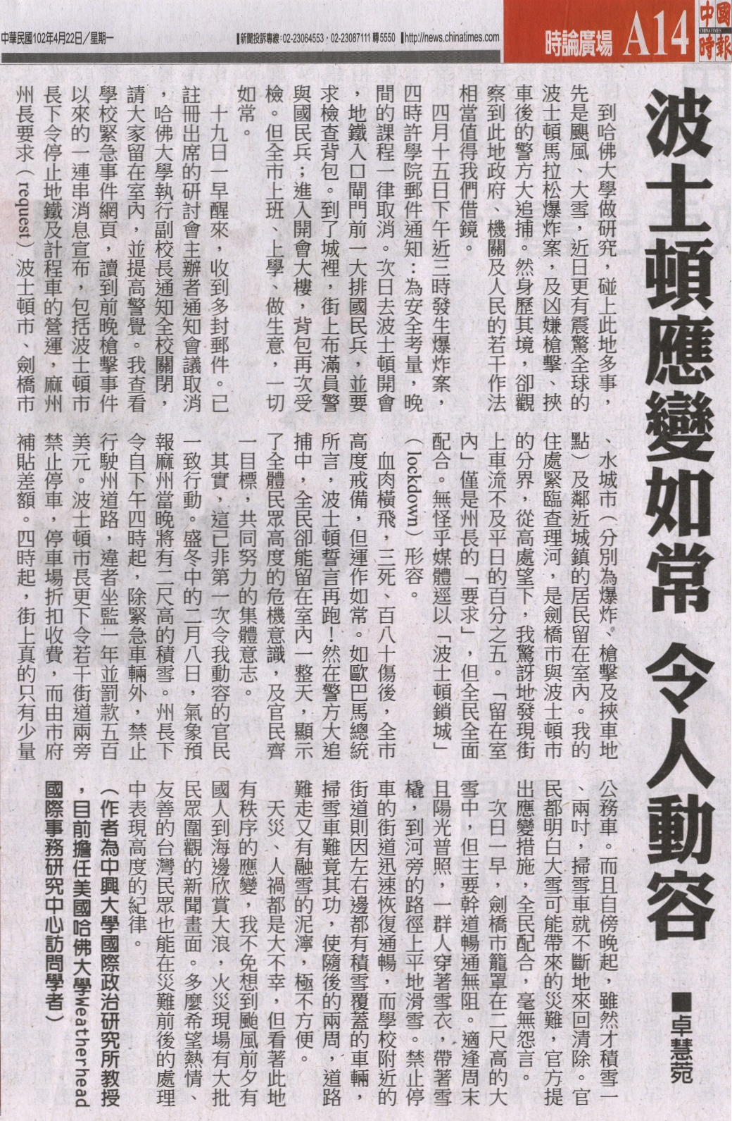 到哈佛大學做研究,碰上此地多事,先是颶風、大雪,近日更有震 驚全球的波士頓馬拉松爆炸案,及凶嫌槍擊、挾車後的警方大追捕。 然身歷其境,卻觀察到此地政府、機關及人民的若干作法相當值得我 們借鏡。