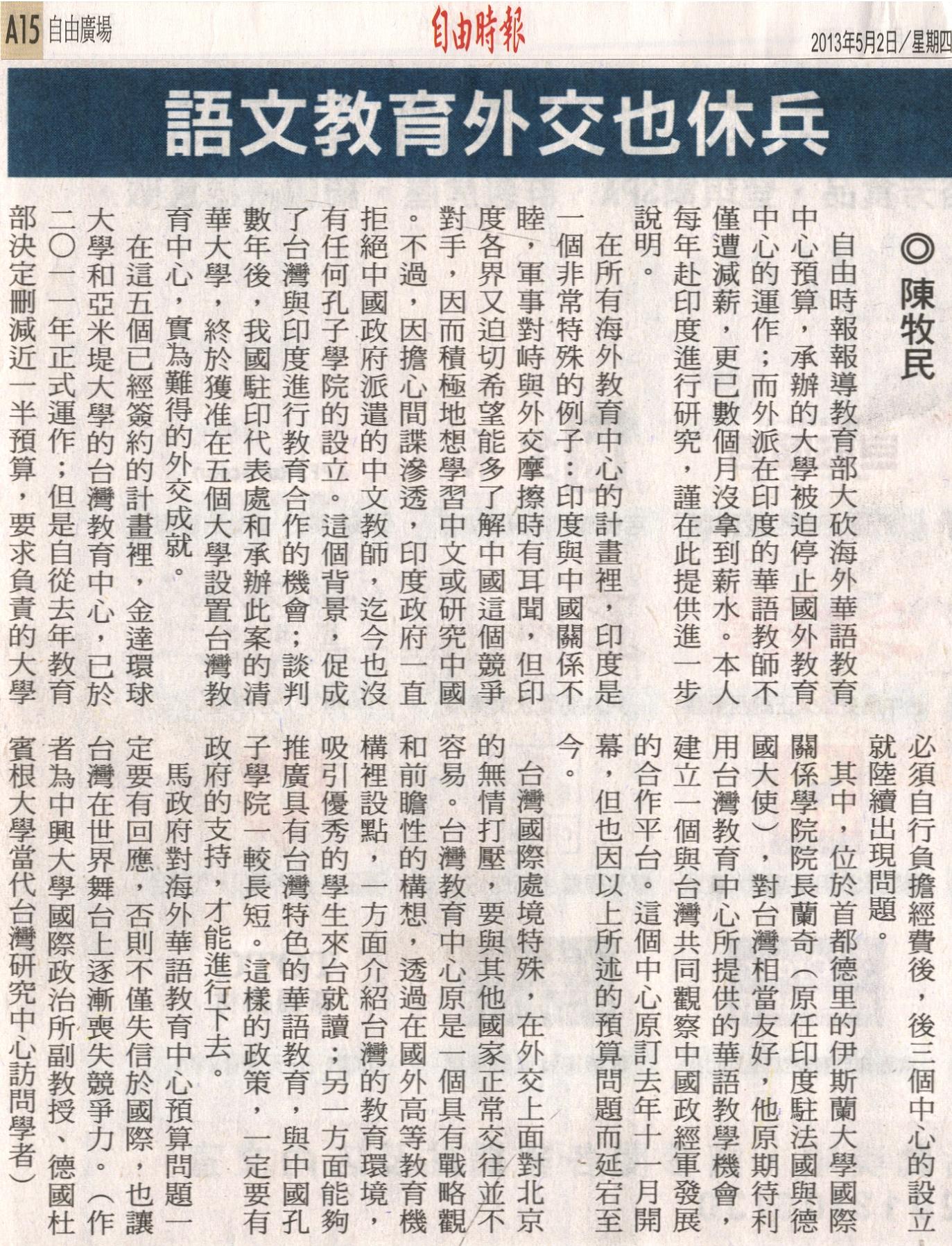 自由時報報導教育部大砍海外華語教育中心預算,承辦的大學被迫停止國外教育中心的運作;而外派在印度的華語教師不僅遭減薪,更已數個月沒拿到薪水。本人每年赴印度進行研究,謹在此提供進一步說明。