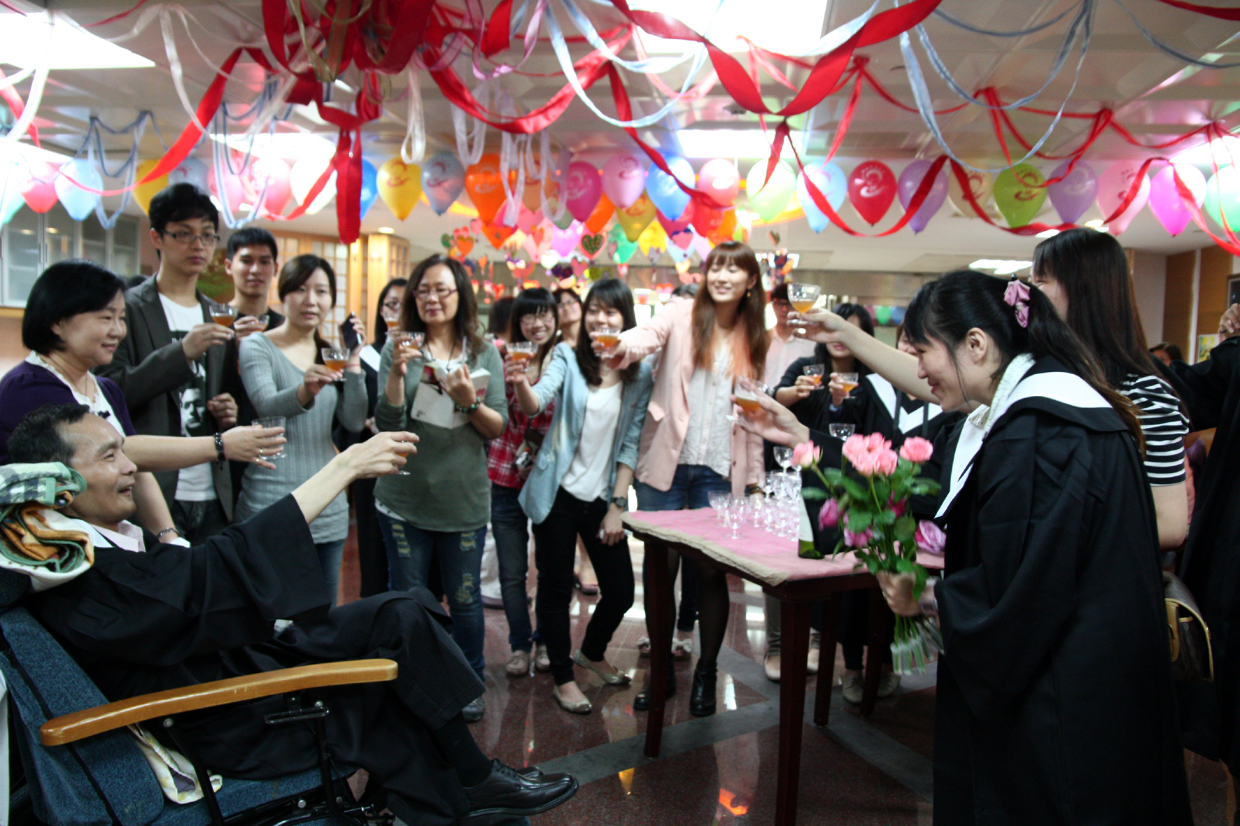 直到畢典的前二天,蔡剛傑的身體仍相當虛弱,昏睡的時間多於清醒。然而,活動當天,他卻撐了將近兩個小時,倒香檳塔、讀卡片、笑笑地跟大家合照,這是他入院以來最開心的一天。願此次畢業典禮中,來自各方的祝福與每一個真心的擁抱,能陪伴他無懼地度過人生中最後的挑戰。