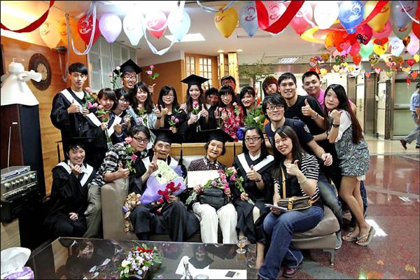 「如果還有機會回去上課,我一定會繼續做好學生的角色!」台中榮總安寧病房日前舉辦一場別開生面的畢業典禮,就讀中興大學中文系學士班的五十三歲蔡剛傑,原定今年畢業,去年發現罹患口腔癌末期休學,上週六(十一日)他穿戴上學士袍、學士帽接受學校老師撥穗、頒發學士學位證書,同學、學弟妹圍繞身旁祝福,場面溫馨感人。