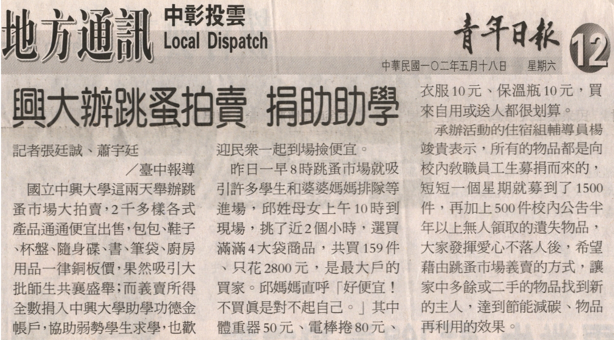【媒體報導】興大辦跳蚤拍賣 捐助助學