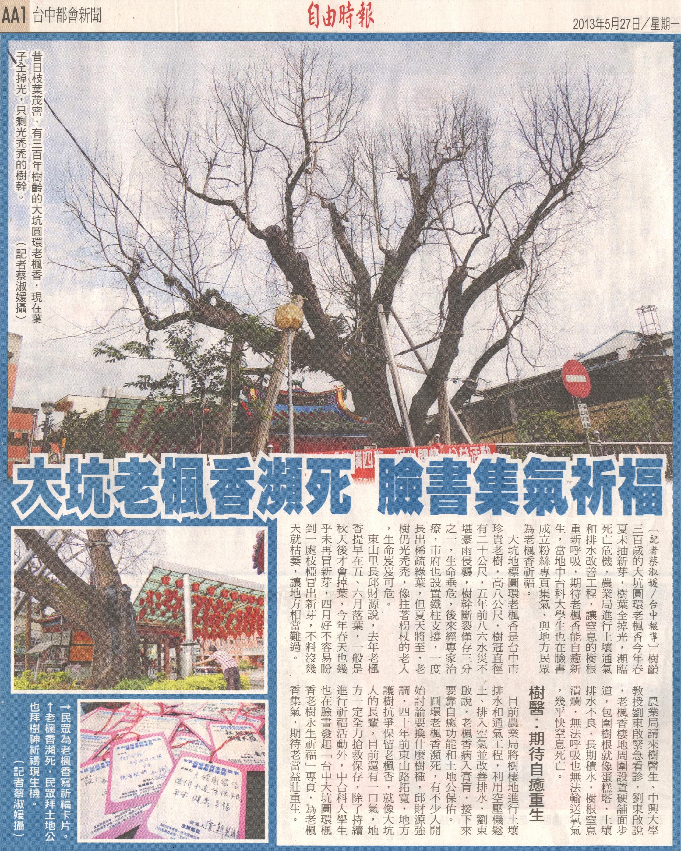 大坑地標圓環老楓香是台中市珍貴老樹,高八公尺,樹冠直徑有二十公尺,五年前八六水災不堪豪雨侵襲,樹幹斷裂僅存三分之一,生命垂危,後來經專家治療,市府也設置鐵柱支撐,一度長出稀疏綠葉,但夏天將至,老樹仍光禿禿,像拄著枴杖的老人,生命岌岌可危。