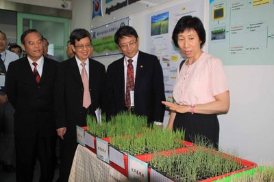 國立中興大學與中央研究院聯手成立的「國際水稻功能性基因體中心」28日揭牌成立,中研院士余淑美(右1 )介紹環境變異對水稻的影響。