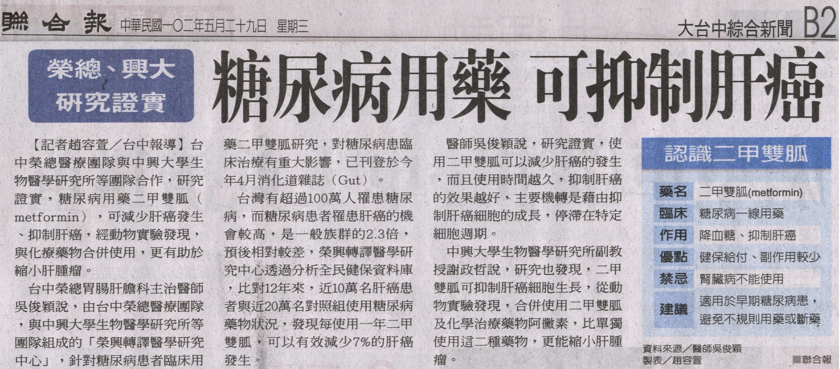 台中榮總醫療團隊與中興大學生物醫學研究所等團隊合作,研究證實,糖尿病用藥二甲雙胍(metformin),可減少肝癌發生、抑制肝癌,經動物實驗發現,與化療藥物合併使用,更有助於縮小肝腫瘤。