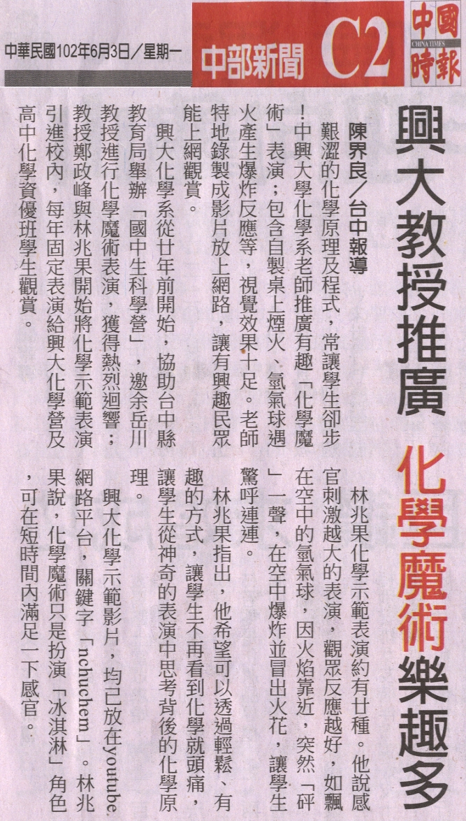 【媒體報導】興大教授推廣 化學魔術樂趣多