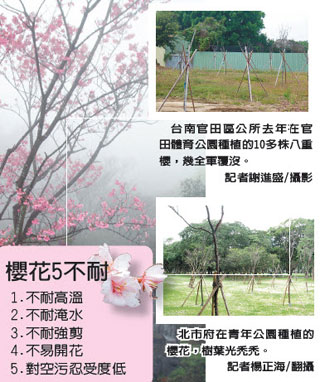 另台南善化糖廠去年在廠區種了200多株山櫻花,才種沒幾天就陣亡9成,如今「櫻花夢」醒,改種植容易存活的羊蹄甲、阿勃勒,「尊重大自然」;台南官田也是屢種屢掛,公所農業課長王鈞賢說「今年是最後一次」。若今年櫻花存活率差,就會放棄再種櫻花。
