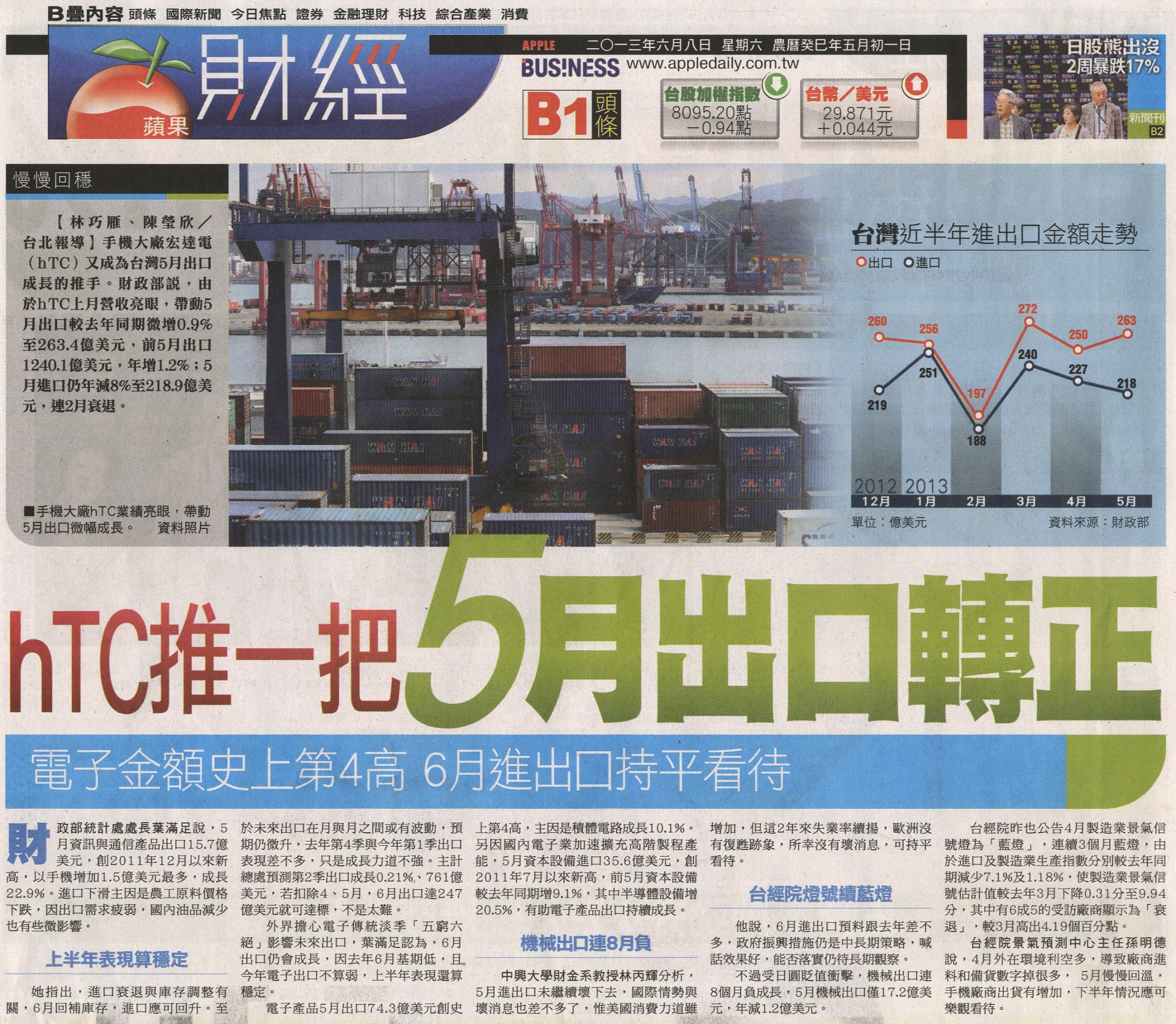 hTC推一把 5月出口轉正 電子金額史上第4高 6月進出口持平看待