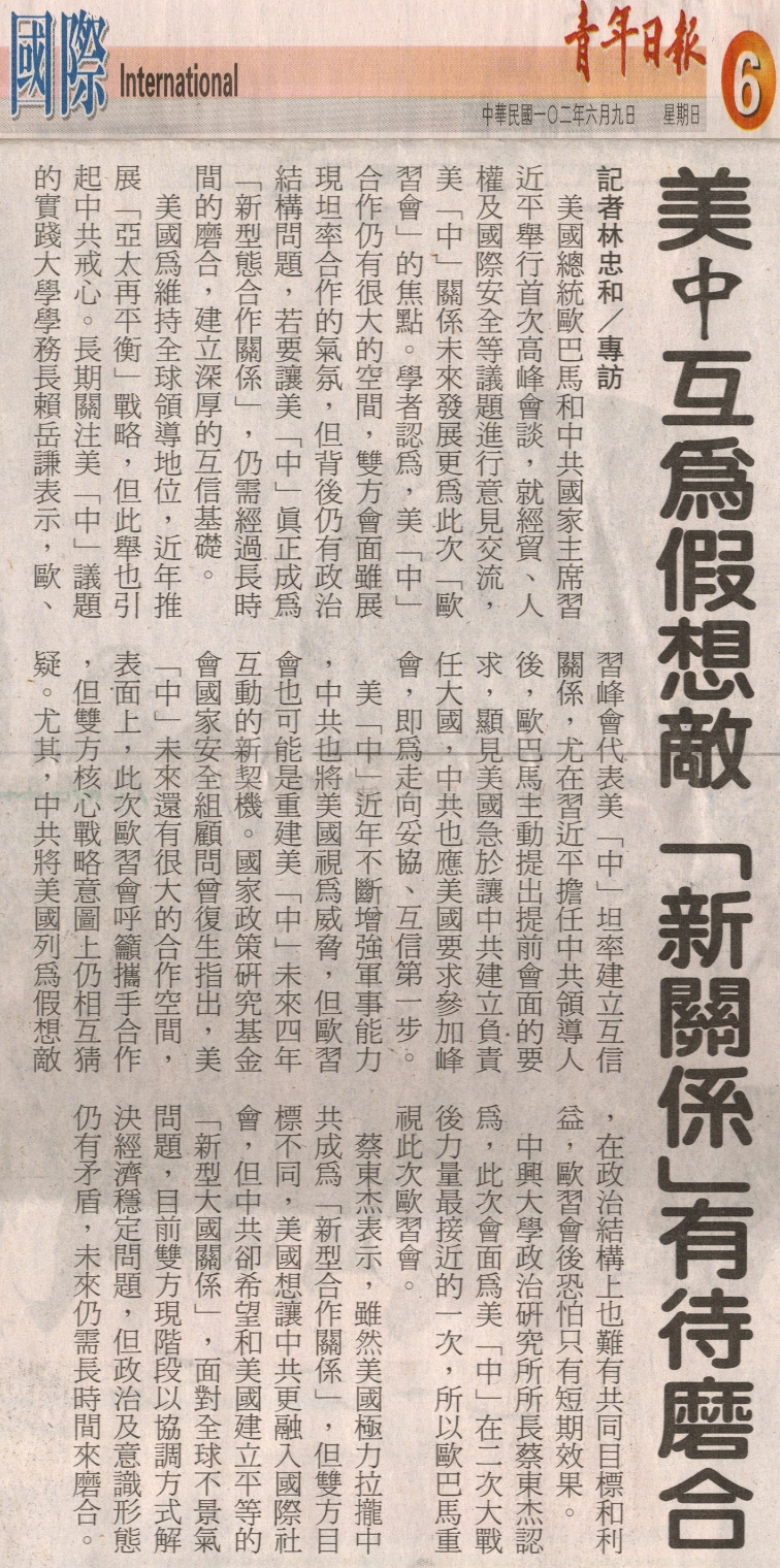 美國總統歐巴馬和中共國家主席習近平舉行首次高峰會談,就經貿、人權及國際安全等議題進行意見交流,美「中」關係未來發展更為此次「歐習會」的焦點。學者認為,美「中」合作仍有很大的空間,雙方會面雖展現坦率合作的氣氛,但背後仍有政治結構問題,若要讓美「中」真正成為「新型態合作關係」,仍需經過長時間的磨合,建立深厚的互信基礎。