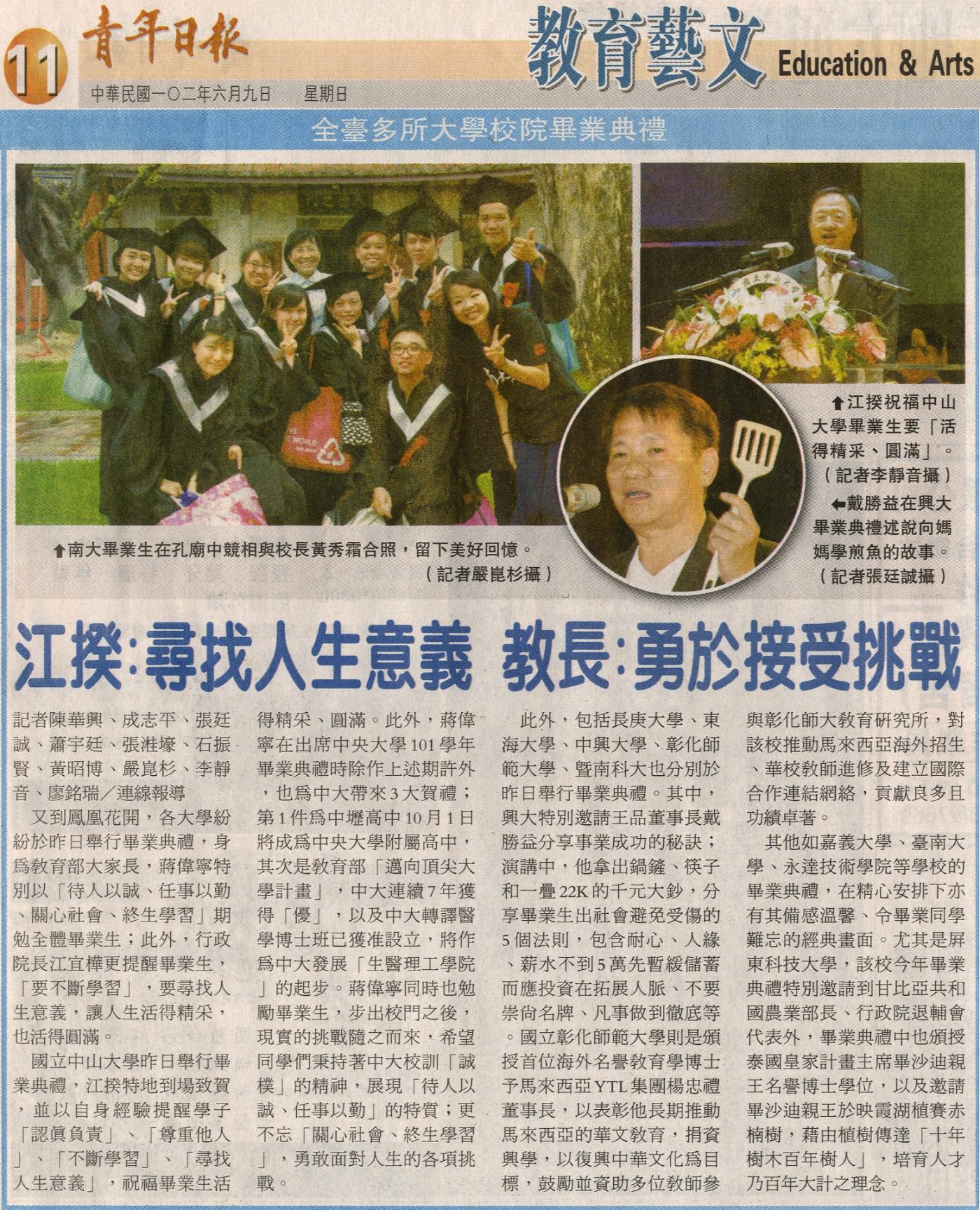 國立中山大學昨日舉行畢業典禮,江揆特地到場致賀,並以自身經驗提醒學子「認真負責」、「尊重他人」、「不斷學習」、「尋找人生意義」,祝福畢業生活得精采、圓滿。此外,蔣偉寧在出席中央大學101學年畢業典禮時除作上述期許外,也為中大帶來3大賀禮;第1件為中壢高中10月1日將成為中央大學附屬高中,其次是教育部「邁向頂尖大學計畫」,中大連續7年獲得「優」,以及中大轉譯醫學博士班已獲准設立,將作為中大發展「生醫理工學院」的起步。蔣偉寧同時也勉勵畢業生,步出校門之後,現實的挑戰隨之而來,希望同學們秉持著中大校訓「誠樸」的精神,展現「待人以誠、任事以勤」的特質;更不忘「關心社會、終生學習」,勇敢面對人生的各項挑戰。