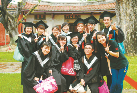 南大畢業生在孔廟中競相與校長黃秀霜合照,留下美好回憶。
