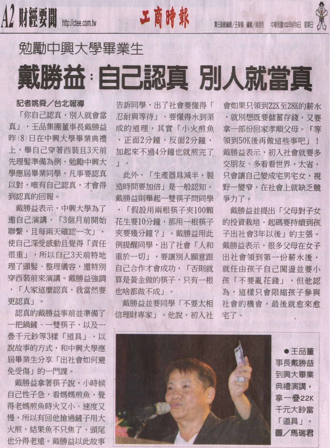 認真的戴勝益事前並準備了一把鍋鏟、一雙筷子,以及一疊千元鈔 等3樣「道具」,以說故事的方式,和中興大學應屆畢業生分享「出 社會如何避免受傷」的一門課。