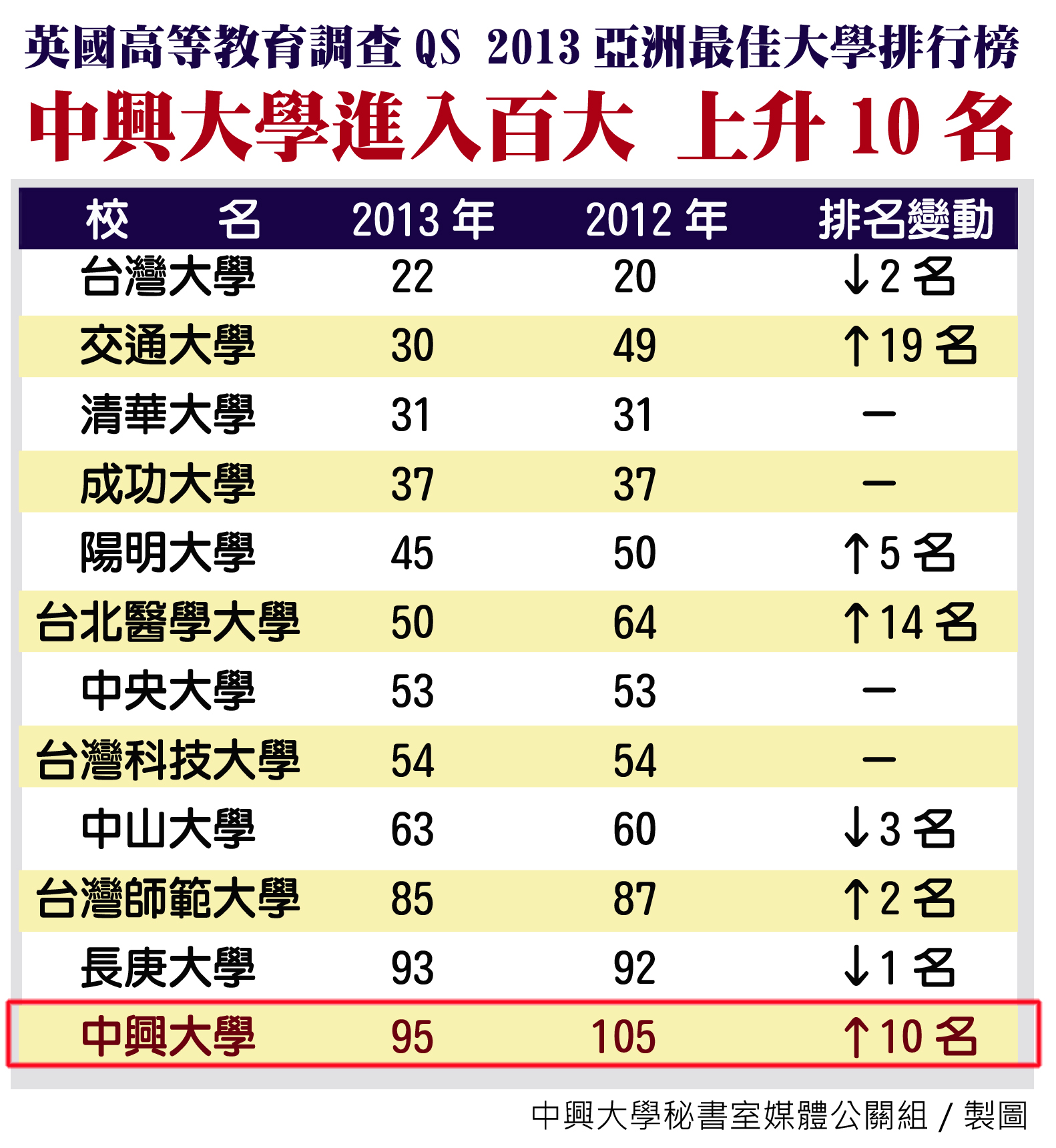 台灣大學(第22,較去年下跌2名)、交通大學(第30,上升19名)、清華大學(第31,與去年相同)、成功大學(第37,與去年相同)、陽明大學(第45,上升5名)、台北醫學大學(第50,上升14名),中央大學(第53,與去年相同)。