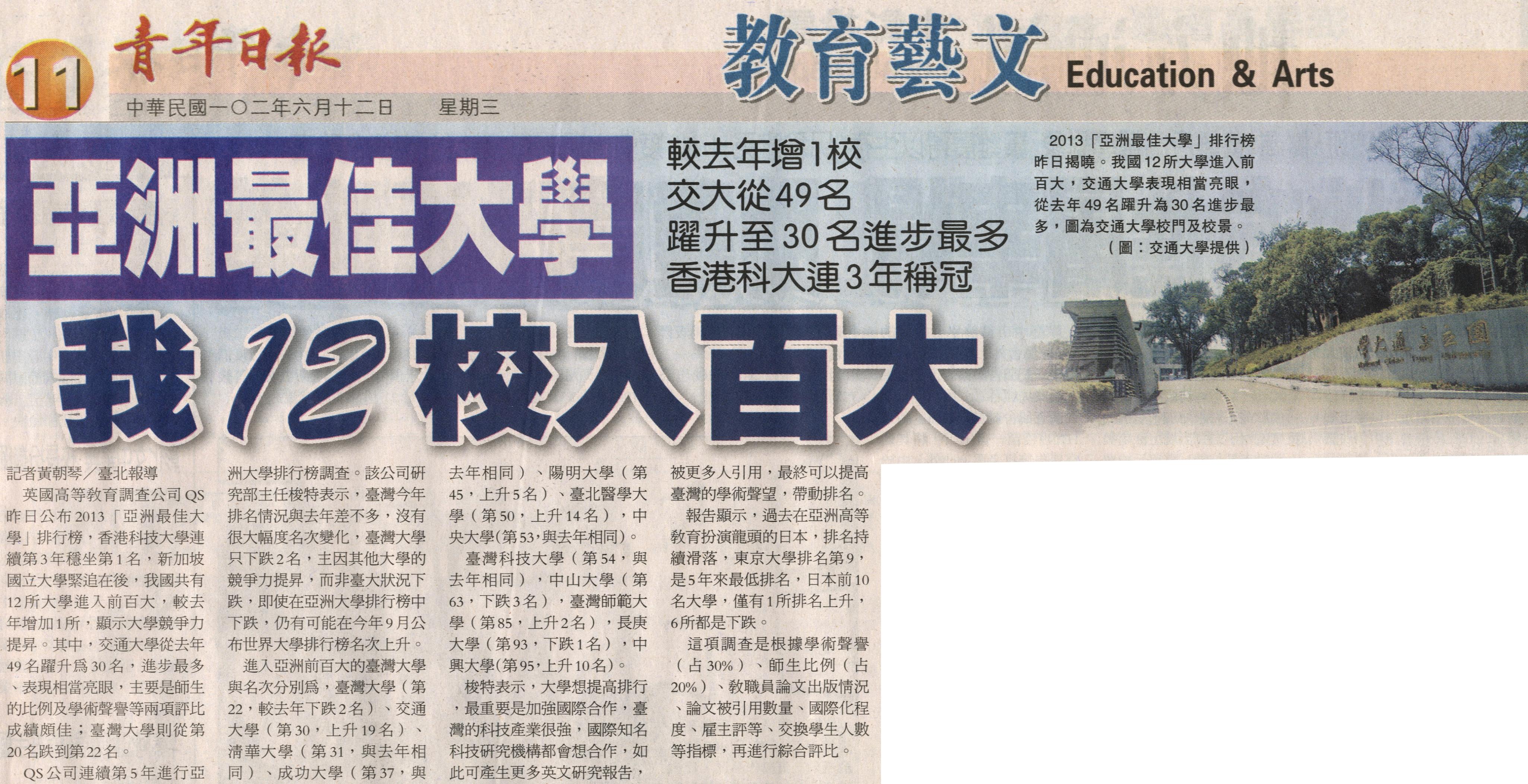 英國高等教育調查公司QS昨日公布2013「亞洲最佳大學」排行榜,香港科技大學連續第3年穩坐第1名,新加坡國立大學緊追在後,我國共有12所大學進入前百大,較去年增加1所,顯示大學競爭力提昇。其中,交通大學從去年49名躍升為30名,進步最多、表現相當亮眼,主要是師生的比例及學術聲譽等兩項評比成績頗佳;臺灣大學則從第20名跌到第22名。