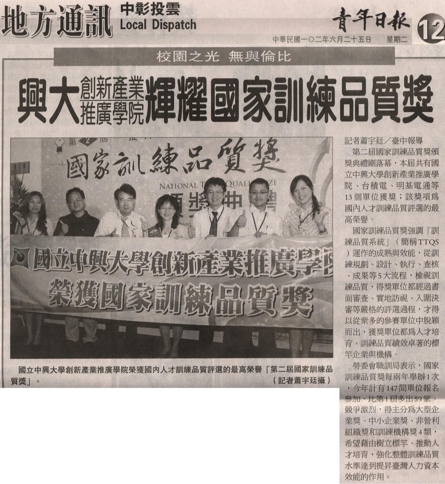 【媒體報導】興大創新產業推廣學院輝耀國家訓練品質獎