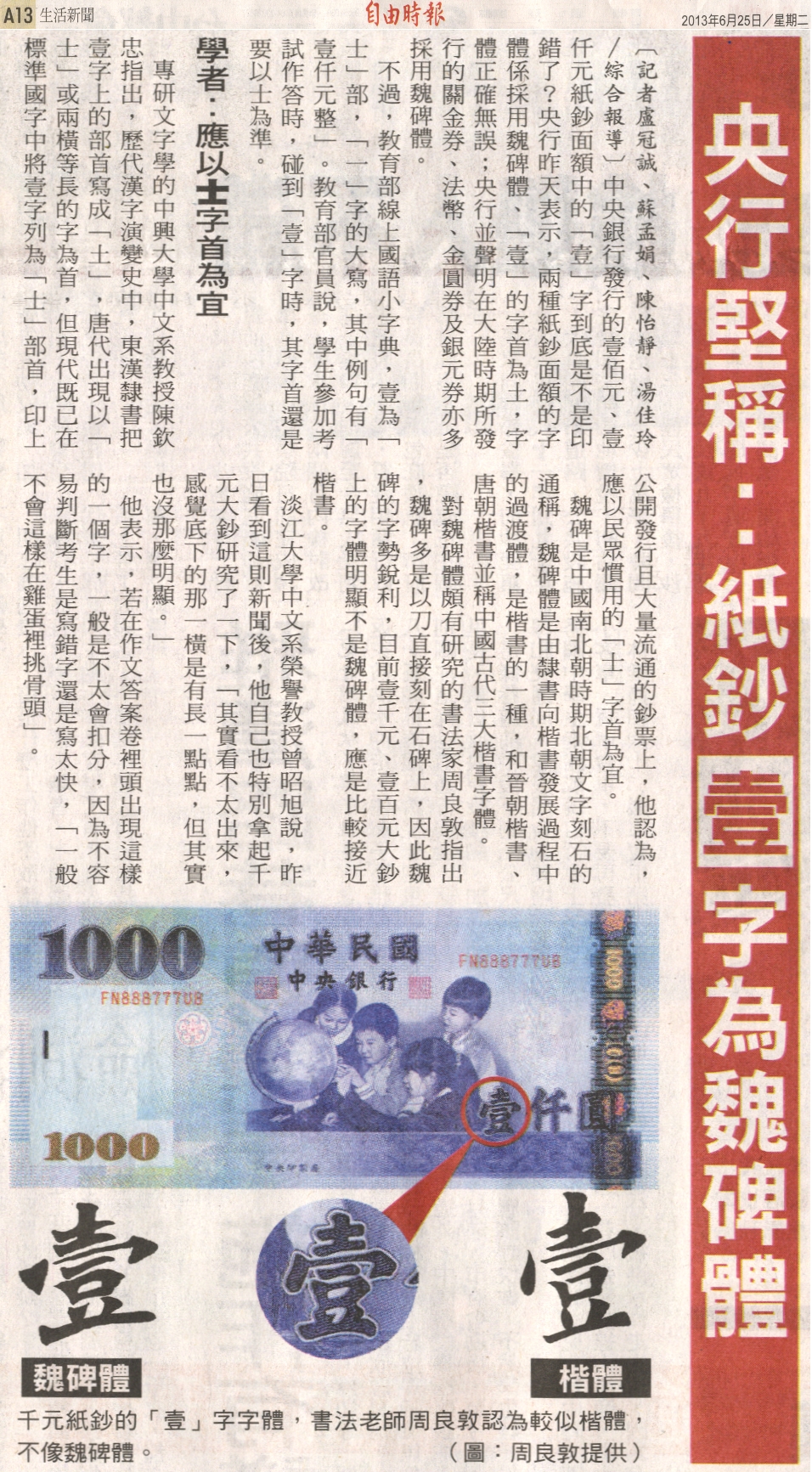 中央銀行發行的壹佰元、壹仟元紙鈔面額中的「壹」字到底是不是印錯了?央行昨天表示,兩種紙鈔面額的字體係採用魏碑體、「壹」的字首為土,字體正確無誤;央行並聲明在大陸時期所發行的關金券、法幣、金圓券及銀元券亦多採用魏碑體。