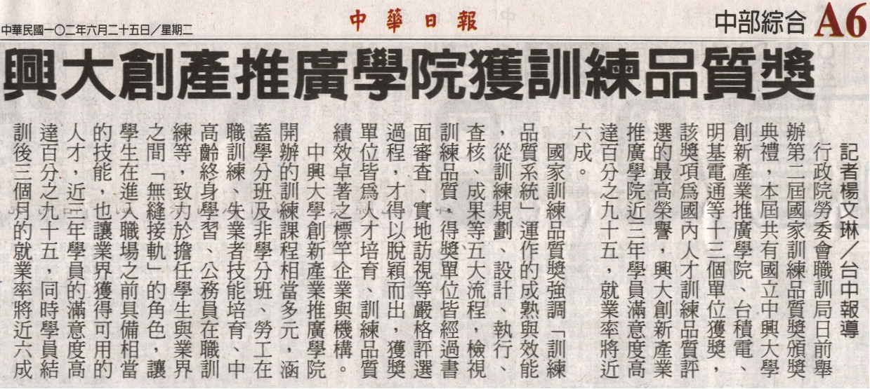 【媒體報導】興大創產推廣學院獲訓練品質獎