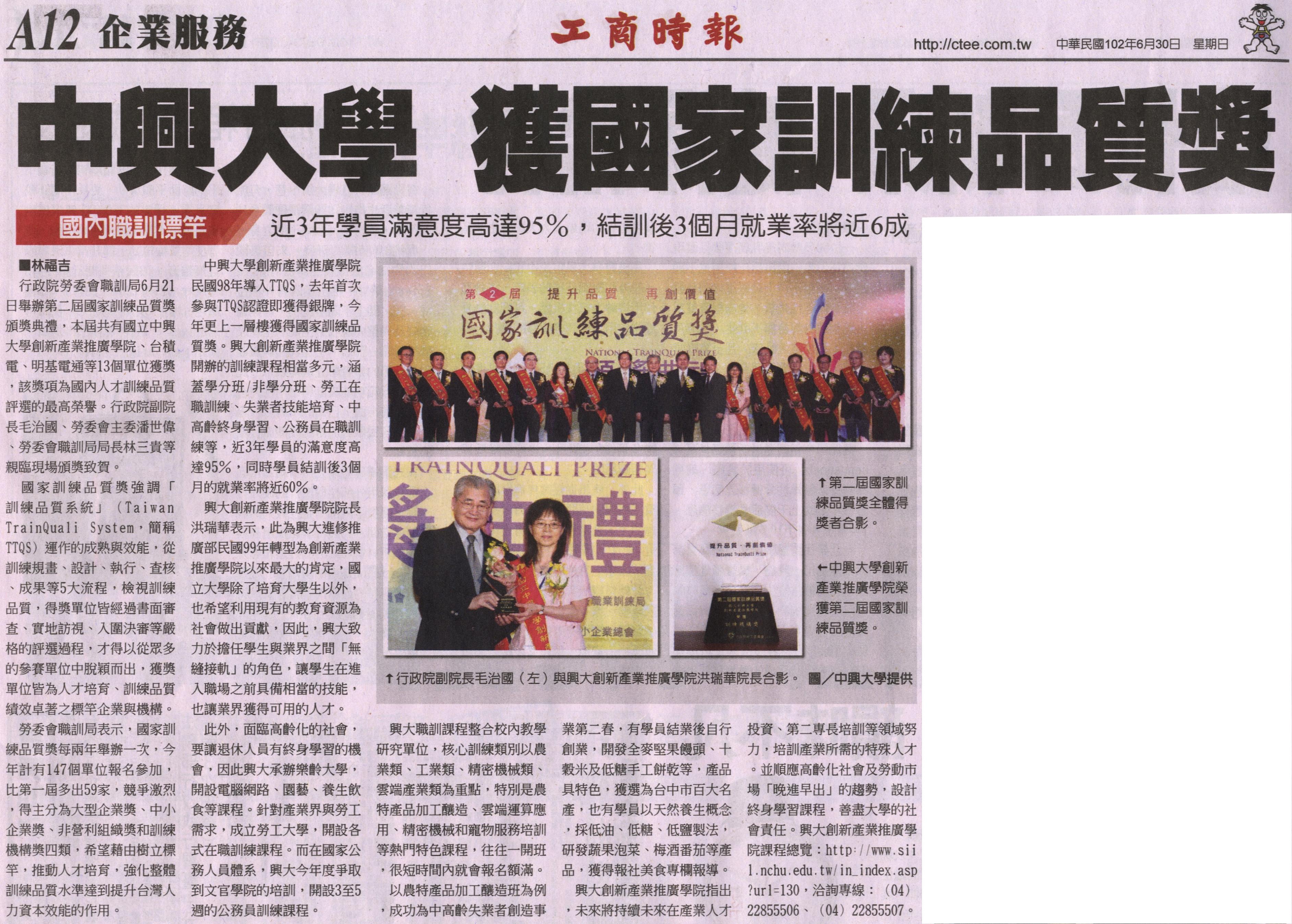 行政院勞委會職訓局6月21日舉辦第二屆國家訓練品質獎頒獎典禮,本屆共有國立中興大學創新產業推廣學院、台積電、明基電通等1 3個單位獲獎,該獎項為國內人才訓練品質評選的最高榮譽。行政院副院長毛治國、勞委會主委潘世偉、勞委會職訓局局長林三貴等親臨現場頒獎致賀。