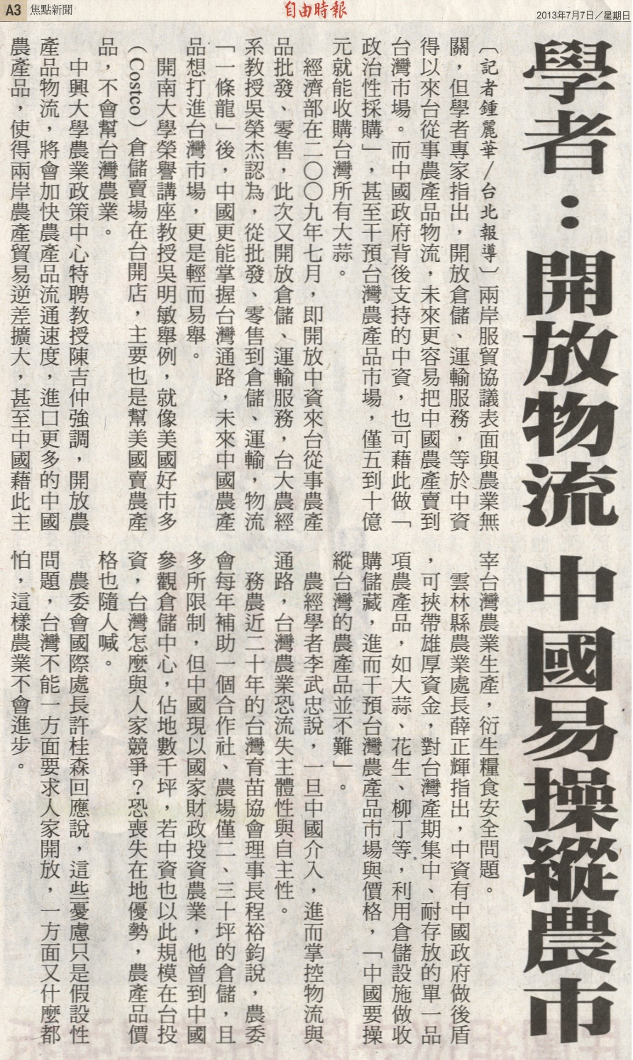 經濟部在二○○九年七月,即開放中資來台從事農產品批發、零售,此次又開放倉儲、運輸服務,台大農經系教授吳榮杰認為,從批發、零售到倉儲、運輸,物流「一條龍」後,中國更能掌握台灣通路,未來中國農產品想打進台灣市場,更是輕而易舉。