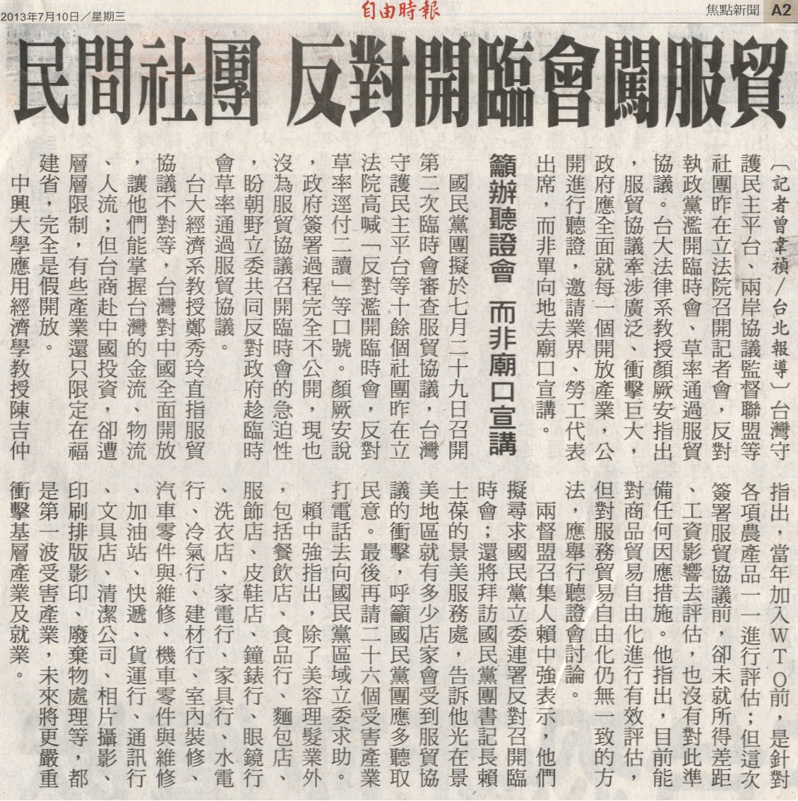 台灣守護民主平台、兩岸協議監督聯盟等社團昨在立法院召開記者會,反對執政黨濫開臨時會、草率通過服貿協議。台大法律系教授顏厥安指出,服貿協議牽涉廣泛、衝擊巨大,政府應全面就每一個開放產業,公開進行聽證,邀請業界、勞工代表出席,而非單向地去廟口宣講。