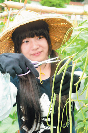 由鶯歌區農會輔導的心希望農場今年首度推出「大專生農場暑期打工計畫」,招收10位大學生來農場下田打工。其中4名不怕曬也不怕髒的女大專生,開心地戴上斗笠、下田摘瓜,表示「衣服越髒代表越努力工作。」