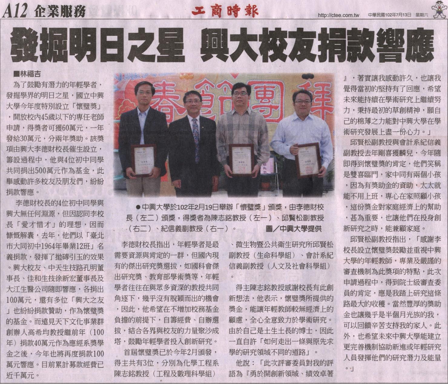 邱賢松副教授指出,「感謝李校長設立懷璧獎鼓勵並重視中興大學的年輕教師,專業及嚴謹的審查機制為此獎項的特點,此次申請過程中,得到院士級審查委員的肯定,應是我踏上研究這條路最大的收穫。當然豐厚的獎助金也讓幾乎是半個月光族的我,可以回饋辛苦支持我的家人。此外,也希望未來中興大學能建立更完善機制協助新進或年輕研究人員發揮他們的研究潛力及能量。」