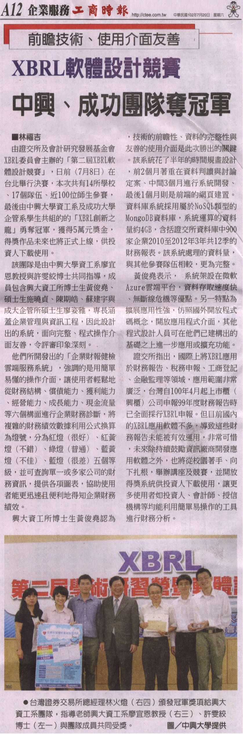 由證交所及會計研究發展基金會XBRL委員會主辦的「第二屆XBRL軟體設計競賽」,日前(7月8日)在台北舉行決賽,本次共有14所學校、17個隊伍、近100位師生參賽,最後由中興大學資工系及成功大學企管系學生共組的的「XBRL創新之龍」勇奪冠軍,獲得5萬元獎金,得獎作品未來也將正式上線,供投資人下載使用。