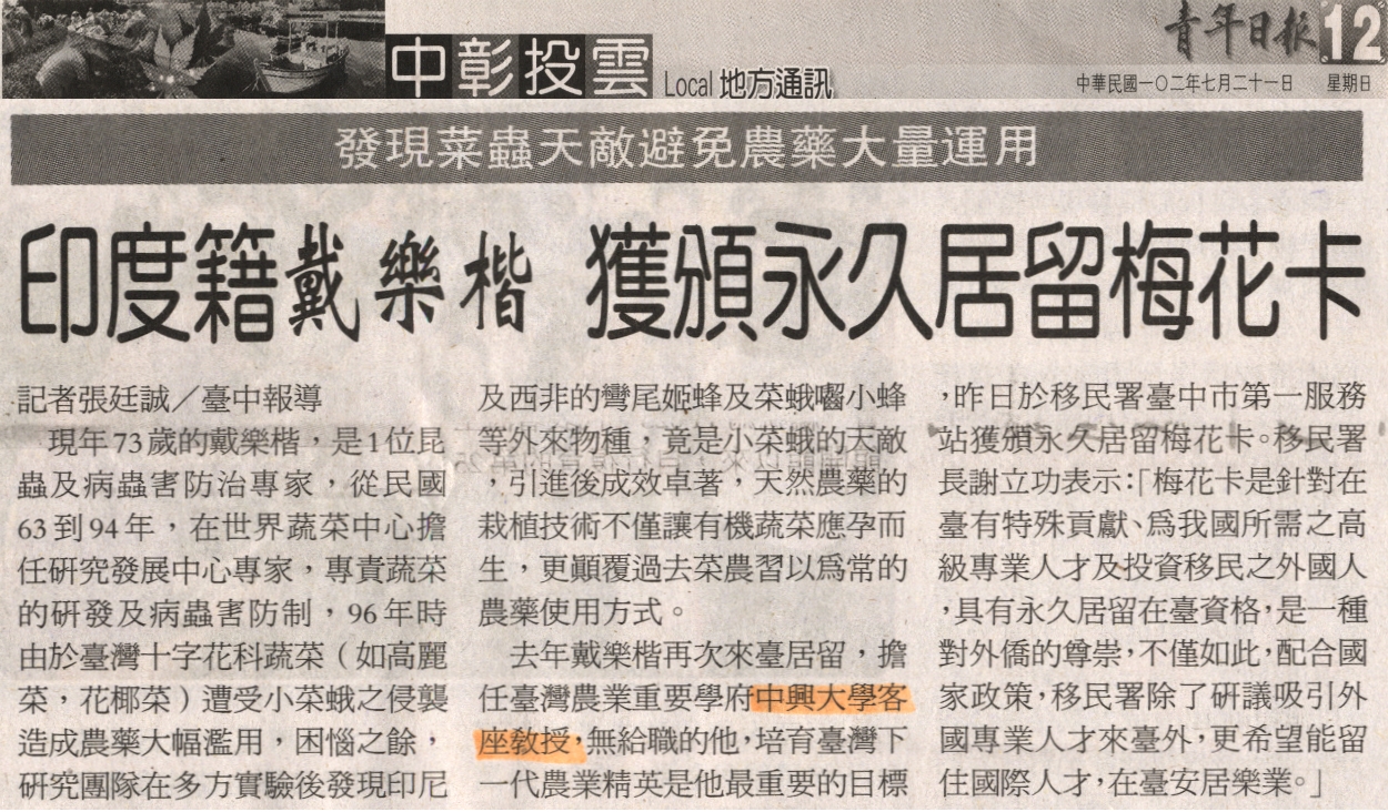 【媒體報導】印度籍戴樂楷 獲頒永久居留梅花卡