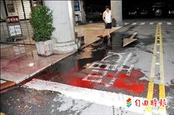 馬政府和中國簽署服貿協議,衝擊台灣數百萬人的就業與生計。公民及勞工團體昨晚在立法院外舉行「民主團結之夜」表達抗議之際,經濟部門口也有不滿服貿協議的人士前往潑漆,宣洩心中的不滿。(記者陳志曲攝)