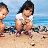 小朋友在墾丁大灣海灘,看著可憐的寄居蟹。