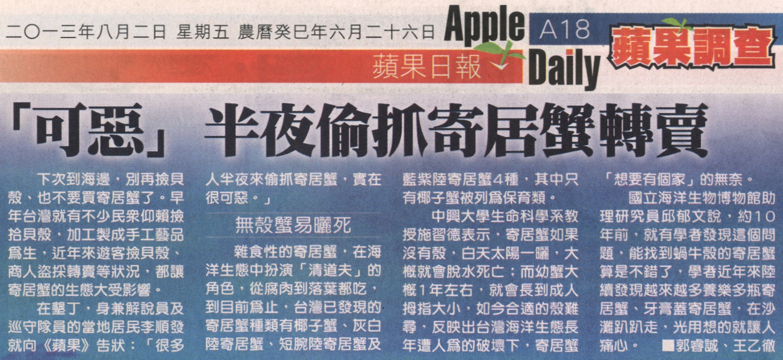 在墾丁,身兼解說員及巡守隊員的當地居民李順發就向《蘋果》告狀:「很多人半夜來偷抓寄居蟹,實在很可惡。」