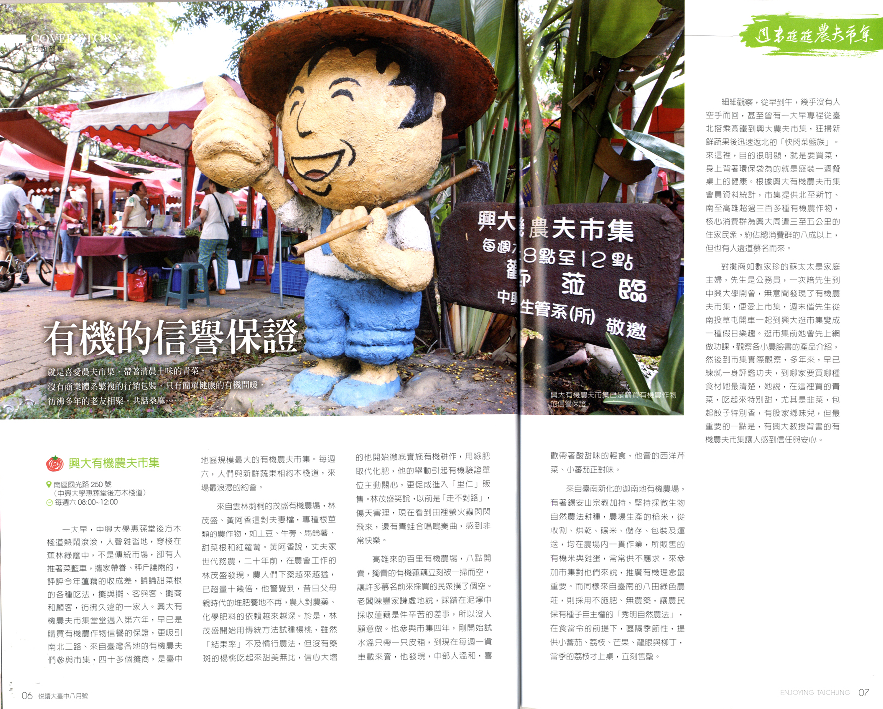 一大早,中興大學惠蓀堂後方木棧道熱鬧滾滾,人聲雜沓地,穿梭在蕉林綠蔭中,不是傳統市場,卻有人推著菜籃車,攜家帶眷、秤斤論兩的,評評今年蓮藕的收成差,論論甜菜根的各種吃法,攤與攤、客與客、攤商和顧客,彷彿久違的一家人。興大有機農夫市集堂堂邁入第六年,早已是購買有機農作物信譽的保證,更吸引南北二路、來自臺灣各地的有機農夫們參與市集,四十多個攤商,是臺中地區規模最大的有機農夫市集。每週六,人們與新鮮蔬果相約木棧道,來場最浪漫的約會。