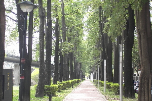 在校園外,有一條長達一點八公里的興大園道,種植筆直的黑板樹還有風情萬種的阿勃勒等樹種,走在林蔭大道上宛如走入時光隧道。由正大門一走進校園,不自覺被右邊一整片濃密的針葉林所吸引,這裡是興大師生口中的「黑森林」,樹種以松樹為大宗,另有柏科、杉科、羅漢松科等。