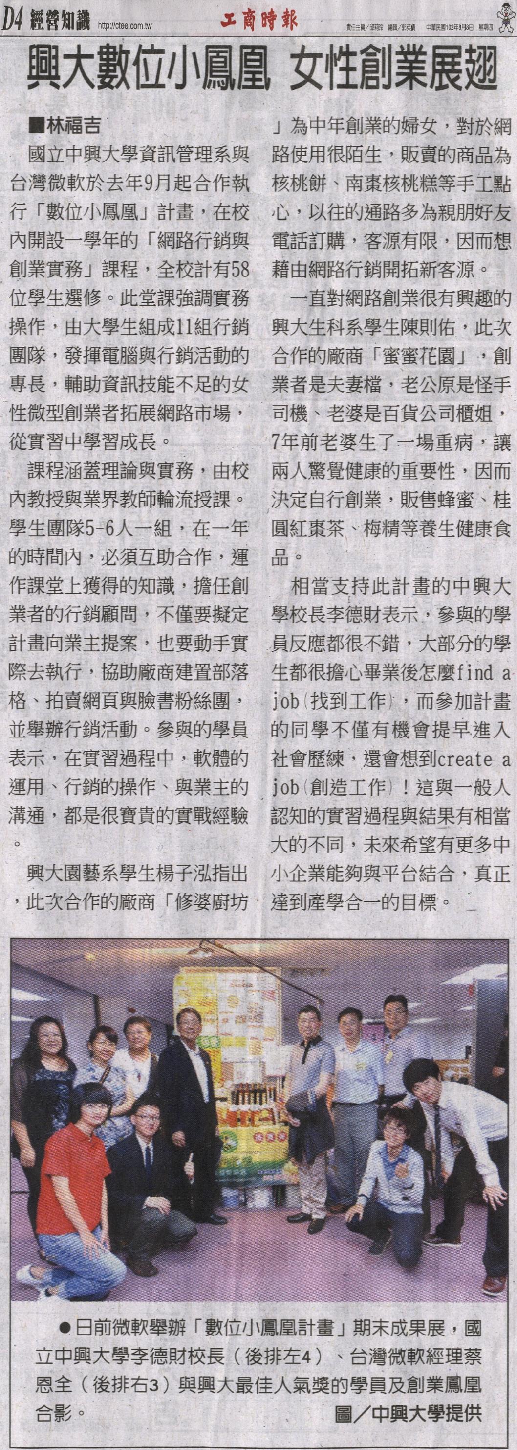 國立中興大學資訊管理系與台灣微軟於去年9月起合作執行「數位小鳳凰」計畫,在校內開設一學年的「網路行銷與創業實務」課程,全校計有58位學生選修。此堂課強調實務操作,由大學生組成11組行銷團隊,發揮電腦與行銷活動的專長,輔助資訊技能不足的女性微型創業者拓展網路市場,從實習中學習成長。