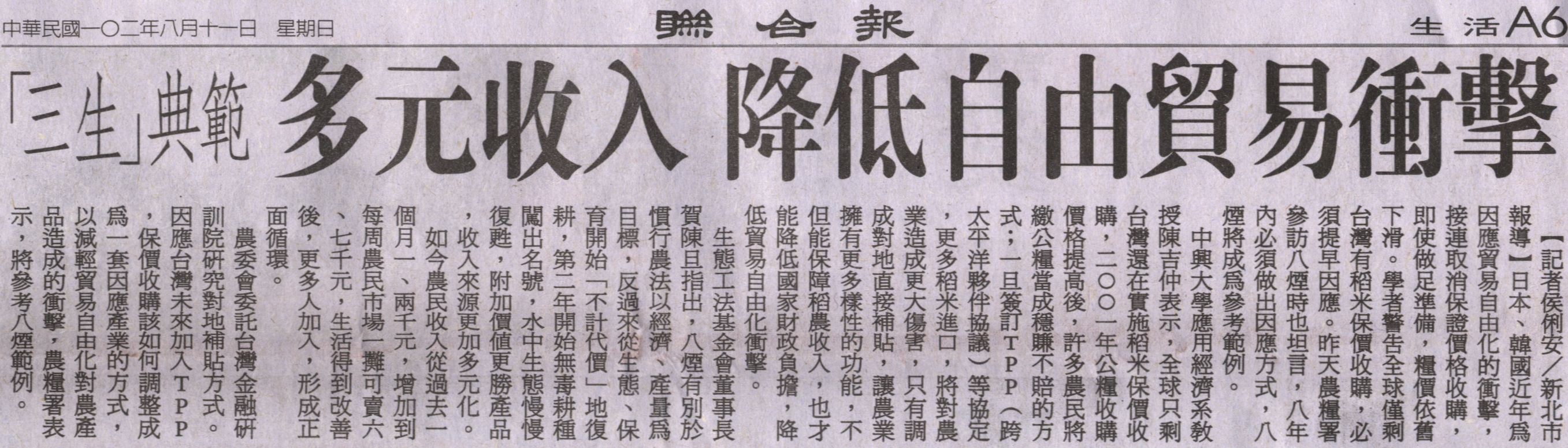 【媒體報導】「三生」典範多元收入 降低自由貿易衝擊