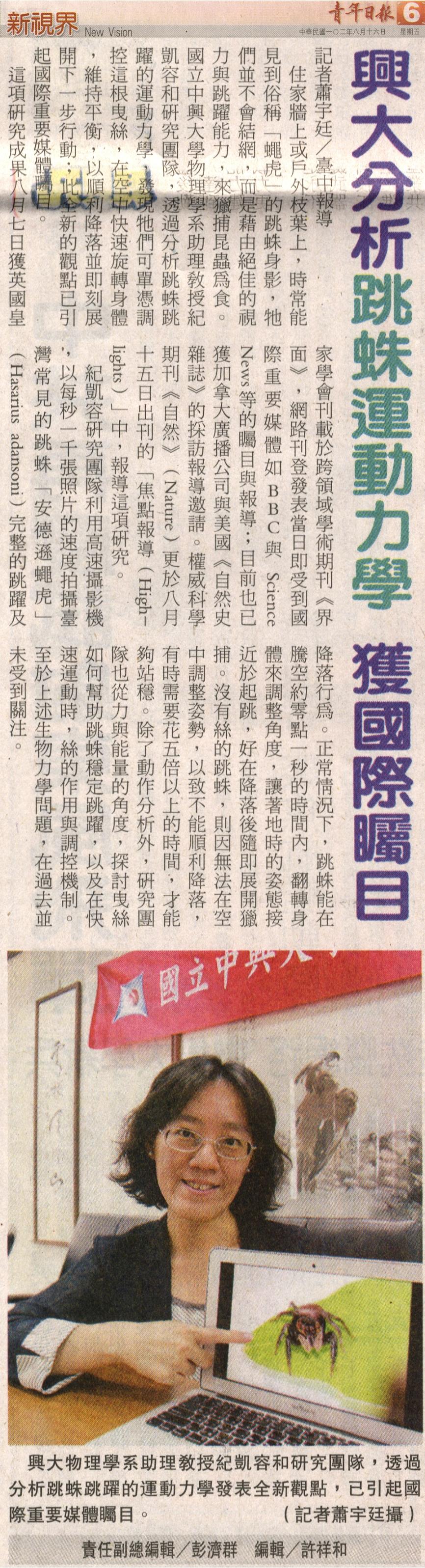 住家牆上或戶外枝葉上,時常能見到俗稱「蠅虎」的跳蛛身影,牠們並不會結網,而是藉由絕佳的視力與跳躍能力,來獵捕昆蟲為食。國立中興大學物理學系助理教授紀凱容和研究團隊,透過分析跳蛛跳躍的運動力學,發現牠們可單憑調控這根曳絲,在空中快速旋轉身體,維持平衡,以順利降落並即刻展開下一步行動;此全新的觀點已引起國際重要媒體矚目。