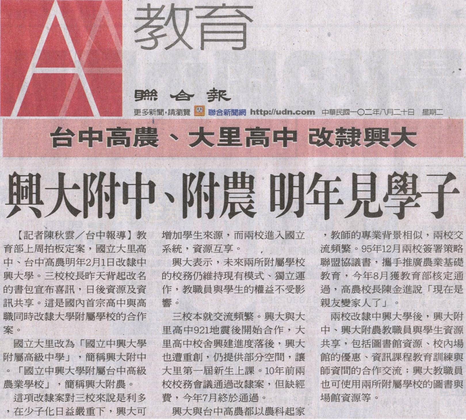 教育部上周拍板定案,國立大里高中、台中高農明年2月1日改隸中興大學。三校校長昨天背起改名的書包宣布喜訊,日後資源及資訊共享。這是國內首宗高中與高職同時改隸大學附屬學校的合作案。