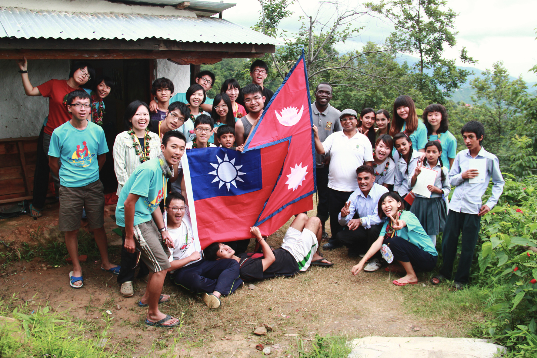 興大學生選定一天作為「台灣日」,烹煮台灣料理讓尼泊爾人品嚐,拍照時大家將尼泊爾與台灣的國旗融合,學生與當地民眾一同合影。(圖/興大國際志工隊提供) |