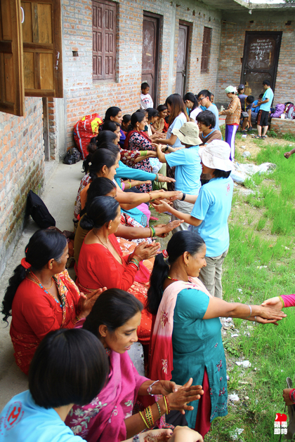 興大學生傳授經絡按摩技巧,讓勞動過度的尼泊爾婦女好舒服。