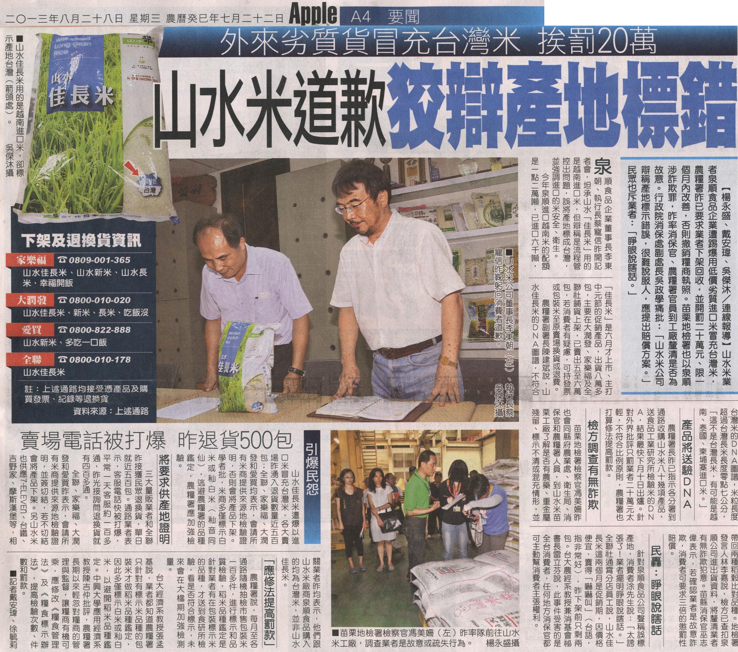 山水佳長米遭爆以進口米冒充台灣米,各大賣場昨湧入退貨數量近五百包;全聯、家樂福、大潤發和愛買均表示,會請所有米商提供來源地檢驗證明,否則會將產品下架。學者批,米商多僅標示白米或秈白米(秈音同仙),逃避農糧署的品種鑑定,農糧署應加強檢驗。